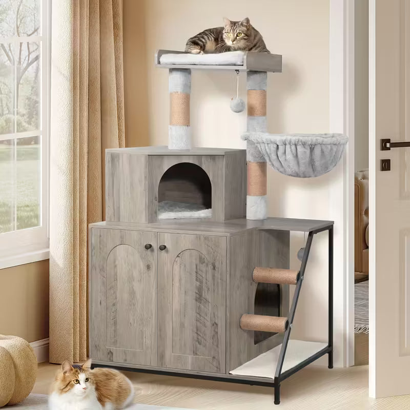 Maison de toilette pour chat multifonctionnelle, combinant un espace de repos et un arbre à chat dans un design élégant en bois.